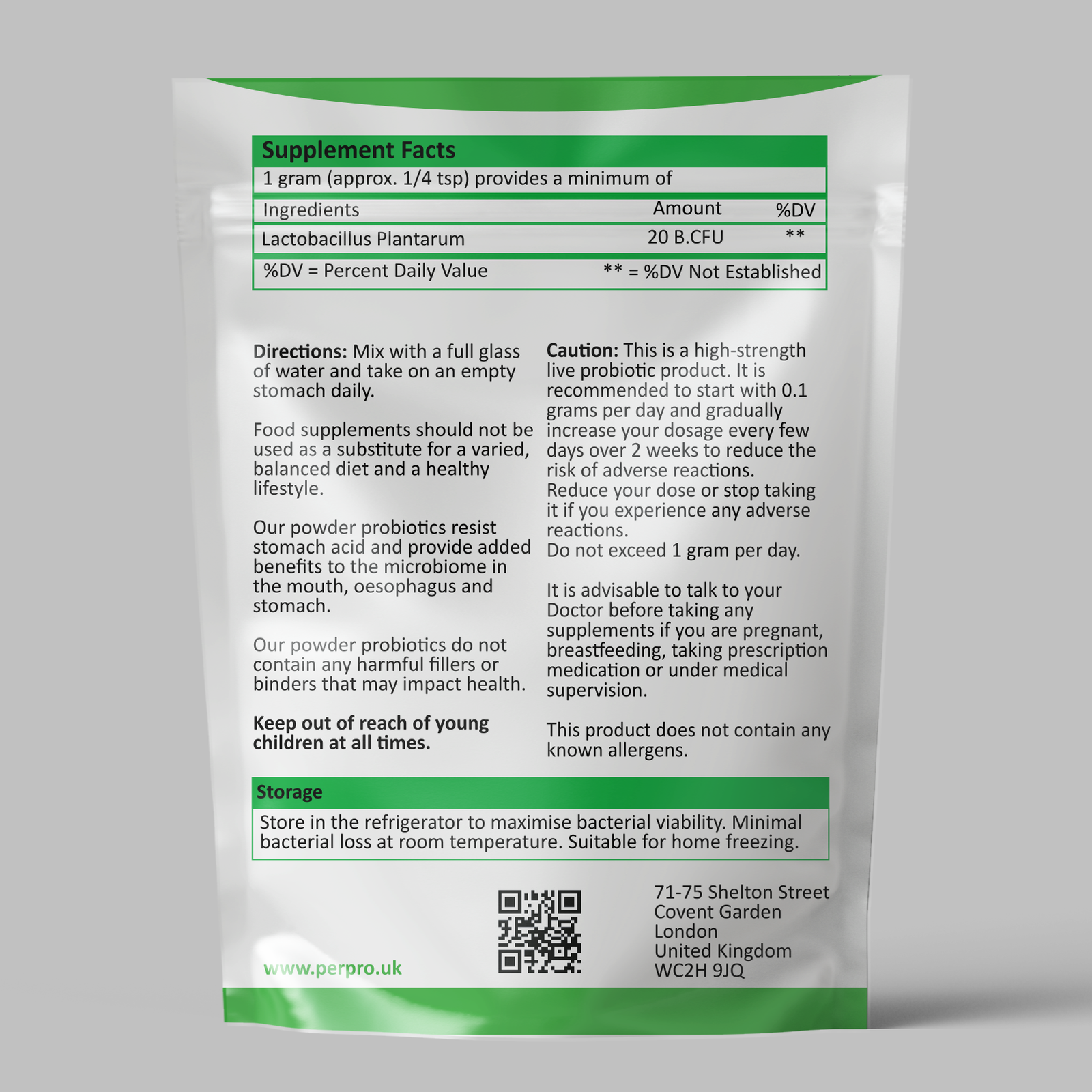Each package contains 30 grams of Lactobacillus plantarum, enough for a full 30-day supply. With a consistent daily intake of 20 Billion CFU, you can enjoy the benefits of this potent probiotic without any hassle.